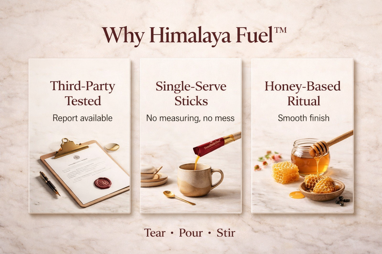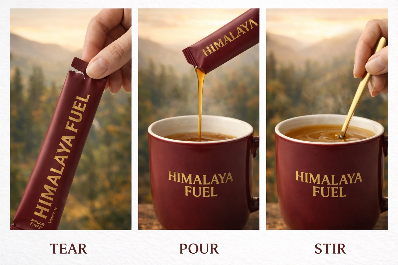 Tear • Pour • Stir. It's that simple. Add to your morning coffee, tea, or water for your daily dose of Himalayan energy.